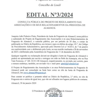 Edital - Consulta Pública do Projeto de Regulamento das Associações e os seus Relacionamentos da Freguesia de Almancil